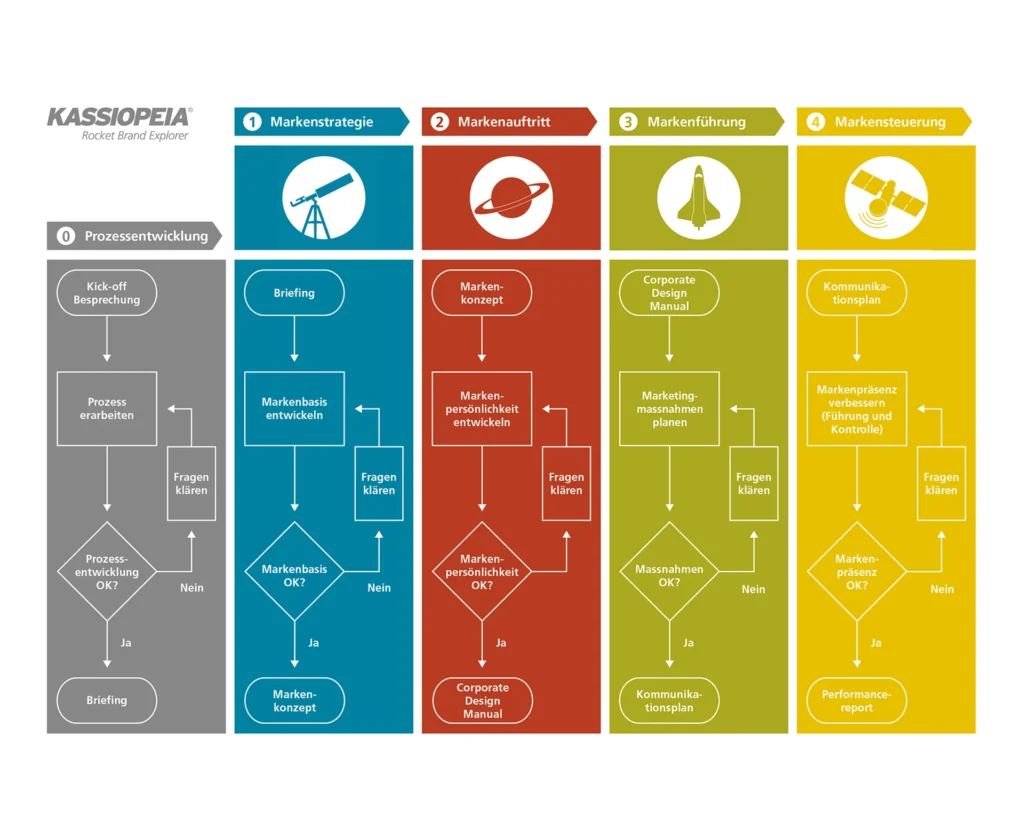 Kassiopeia Brand Explorer: Marketing-Erfolgstool Wie ein stabiles Bauwerk benötigen auch Aufbau, Entwicklung und Pflege einer starken Marke solide Grundpfeiler. Auf dieser Erkenntnis basierend entwickelte Rocket in Zusammenarbeit mit der Hochschule Luzern und weiteren Partnern den Kassiopeia Brand Explorer. Die Anwendung dieses Tools garantiert eine individuelle, systematische sowie zielführende Vorgehensweise bei der Planung und Realisierung von Kommunikationsprojekten. Der Kassiopeia Brand Explorer eignet sich für eine Schrittweise Planung und Umsetzung individueller, kundenspezifischer Bedürfnisse. In der Praxis hat er sich speziell bei der Entwicklung neuer Marken, beim Redesign sowie bei der Positionierung bestehender Produkt- oder Unternehmensmarken bewährt. Der Kassiopeia Brand Explorer besteht aus einem Prozessentwicklungsschritt sowie aus vier Etappen zur Markenentwicklung. Prozessentwicklung Um den individuellen Bedürfnissen einer Marke beziehungsweise eines Unternehmens zu entsprechen, beginnen wir bei Branding-Projekten mit der Prozessdefinition. Ausgangslage bildet ein gemeinsames Kickoff-Meeting. Der Start erfolgt auf der Basis eines vom Kunden erarbeiteten Briefings oder auf der «grünen Wiese» mit der gemeinsamen Definition der Bedürfnisse. Mithilfe eines Strategieworkshops oder eines Marketing Check-ups können Fragen geklärt und die Basis für Ideen gemeinsam erarbeitet werden. So legen wir die Grundlage für eine sinnvolle sowie zielgerichtete Projektplanung und Budgetierung. Markenstrategie Anhand des Briefings entwickeln wir die Markenbasis. Dabei rücken Marken- und Unternehmenswerte, Stakeholder beziehungsweise potenzielle Kundenpersonas und deren Customer Journey in den Fokus. Die Strategie entsteht in enger Zusammenarbeit zwischen Agentur und Kunde. Nach dieser ersten Etappe liegt das Markenkonzept vor. Markenauftritt Mit dem Markenkonzept vor Augen wird der Markenauftritt kreiert. Dazu gehören Logo, Claim, Typografie, Bilderwelt und Kommunikationsmittel wie etwa die Website. Stehen diese Basiselemente, werden die Markenguidelines in einem Corporate Design Manual festgehalten. Rocket erstellt für dich auf Wunsch auch einen Online-Styleguide mit Bilddatenbank und Downloadbereich. So garantieren wir dir wie auch deinem Team weltweit und zu jeder Zeit den Zugriff auf die wichtigsten Marketinginstrumente. Markenführung Stehen die Corporate-Design-Richtlinien und die Basis des Markenauftritts, starten wir mit der Planung und Umsetzung der Marketingmassnahmen. Die Markenführung befasst sich mit der Auswahl der richtigen Kommunikationsinstrumente wie etwa Suchmaschinenmarketing, Direktmails oder Aussenwerbung. Dabei stützen wir uns auf die erarbeitete Markenstrategie, etwa die Customer Journey und die definierten Zielgruppen. In einem Kommunikationsplan werden die einzelnen Instrumente zu einem schlagkräftigen Mix orchestriert. Markensteuerung Sobald die Kommunikationsmassnahmen live sind, kümmern wir uns um die oft vernachlässigte, vierte Etappe: die Markensteuerung. Dabei geht es um die Überprüfung der umgesetzten Massnahmen. Wir analysieren die gewählten Massnahmen und überlegen, wie wir diese weiter verbessern können. So garantieren wir einen höchstmöglichen Return on Marketinginvestment beziehungsweise ganz einfach, dass dein Werbefranken bestmöglich eingesetzt wird. Ein regelmässiges Performance Reporting und stetige kleinere Justierungen führen zum Erfolg. Share on Zurück zum Magazin Hat das Vorgehen mit dem Kassiopeia Brand Explorer dein Interesse geweckt? In einem Erstgespräch besprechen wir einfach und unkompliziert die Rahmenbedingungen, den Umfang sowie Leistungen einer allfälligen Zusammenarbeit. Dein direkter Kontakt: +41 41 500 10 11 oder mschuermann@rocket.ch